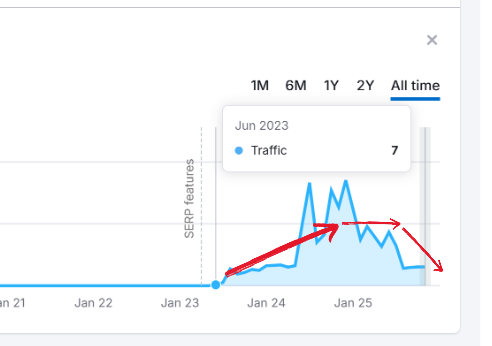 Les contenus éditoriaux ne sont plus mis à jours et leurs courbes de trafic ressemble à ça :