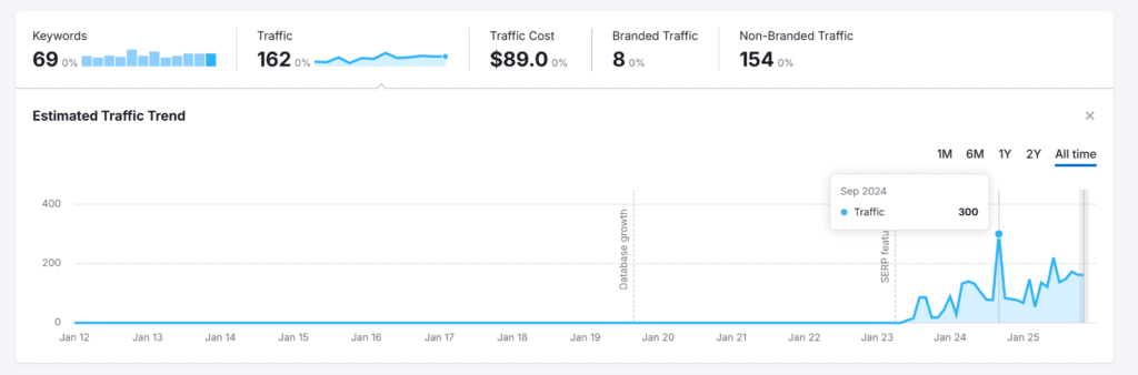 Le boost SEO n’apparaît pas immédiatement. Mais vous pouvez le voir sur ce graphique, après la mise à jour, il y a clairement une montée du trafic SEO :