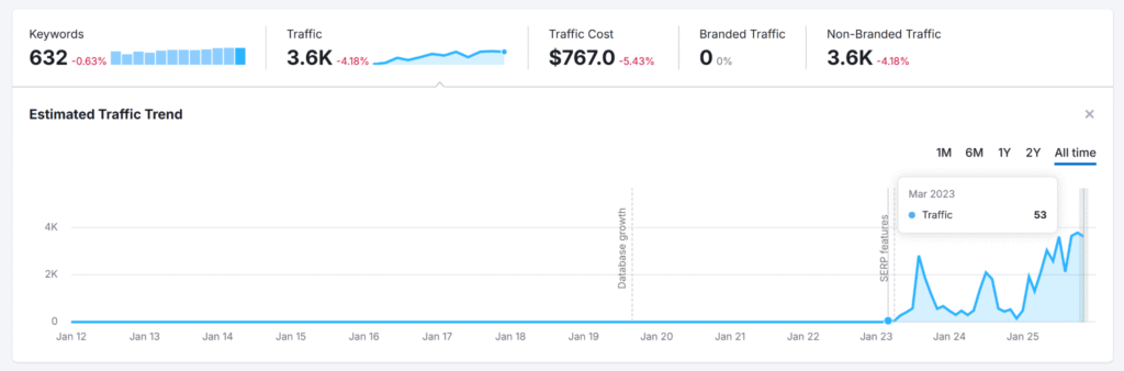 Dans ce dernier exemple, ça a pris 2 ans pour monter de 50 clics/mois à 3600 clics/mois.