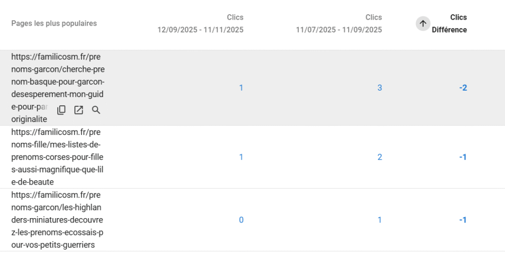 Ce qui m’intéresse ici, c’est la différence de clics sur la période choisie. Filtrez pour mettre en avant les pages qui ont perdus le plus de trafic :