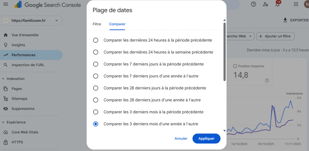 SI vous n’avez pas encore un an de data, comme c’est le cas pour ce site, vous pouvez aussi faire les 2-3 derniers mois versus la période précédente.
